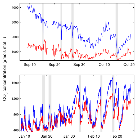 上圖為夏秋季不同土壤剖面深度(5cm、12.5cm、35cm)CO2通量R(上)和CO2濃度(下)的變化情況,降雨情況參見右縱坐標(biāo)(摘自Z.Nagy等,2011)。研究表明,渦動(dòng)法測(cè)量低估了CO2通量(特別是在通量較低的情況下),干旱區(qū)草原在暴雨后往往會(huì)發(fā)生CO2由大氣向土壤的逆向通量。