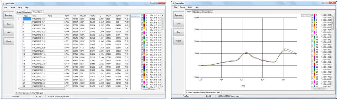 測得的數(shù)據(jù)以圖形或數(shù)據(jù)表的形式實時顯示在儀器的顯示屏上。這些數(shù)據(jù)都可以儲存在儀器的內(nèi)存里并傳輸?shù)诫娔X里。測量儀由可充電鋰電池供電,不需要使用電腦即可獨立進行測量。測量儀配備全彩色觸屏顯示器、內(nèi)置光源、內(nèi)置GPS和用于固定樣品的無損葉夾。