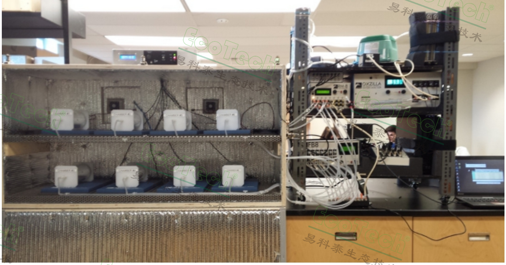 Moll等(2012)利用SSI動物呼吸代謝測量系統(tǒng)(配置見右圖),對切葉蟻運輸葉片的能量代謝情況進行了研究,研究結果參見:The energetics of running stability: costs of transport in grass-cutting ants depend on fragment shape. The Journal of Experimental Biology 215, 161-168