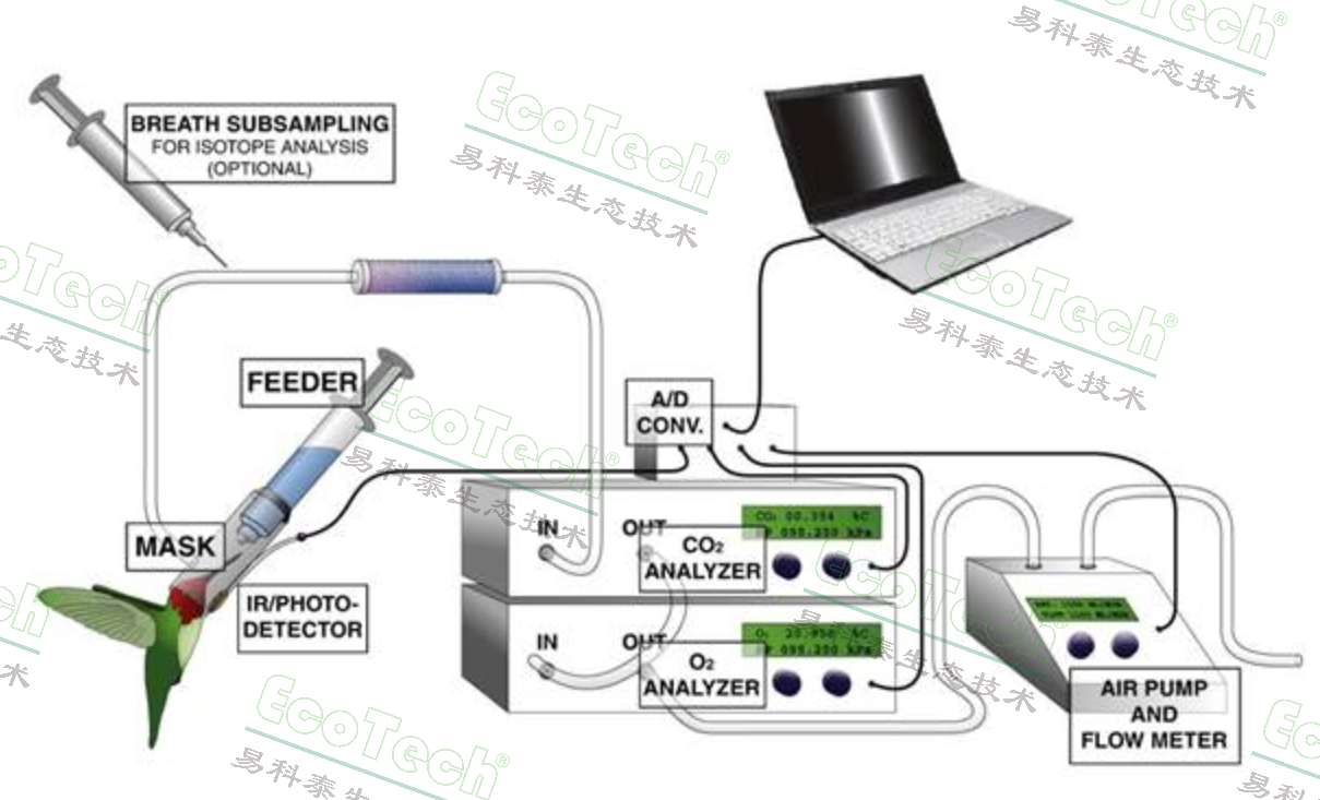Welch Jr等(2011)利用飼喂罩作為呼吸室(系統(tǒng)配置包括飼喂罩、CA-10二氧化碳分析儀、FC-10氧氣分析儀、SS-3氣體抽樣單元、UI-2數(shù)據(jù)采集系統(tǒng)等,參見下圖),對蜂鳥能量代謝進行了研究,研究結果參見:The power of feeder-mask respirometry as a method for examining hummingbird energetics. Comparative Biochemistry and Physiology. Part A 158, 276-286.