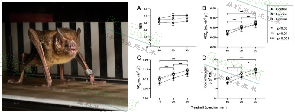 多倫多大學(xué)生理學(xué)家朱莉婭·羅西和加拿大麥克馬斯特大學(xué)肯尼思·韋爾奇從吸血蝙蝠經(jīng)常依靠奔跑來追蹤和捕獲獵物的觀察中找到靈感,通過FMS便攜式能量代謝測(cè)量儀和動(dòng)物跑步機(jī),以及采用同位素標(biāo)記的牛血食物來研究24只吸血蝙蝠的新陳代謝機(jī)制。通過讓蝙蝠以不同的速度(每分鐘10、20和 30米)在跑步機(jī)上奔跑,同時(shí)測(cè)量它們的新陳代謝率(耗氧量和二氧化碳產(chǎn)生量等指標(biāo),見下圖右)。