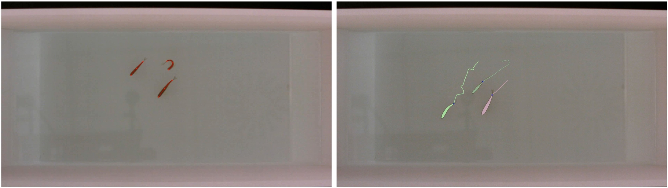 - 軟件可識別特定身體的點(diǎn)位(如尾、頭、中線中點(diǎn)、重心),跟蹤這些點(diǎn)用以研究運(yùn)動學(xué)(如擺尾頻率、身體擺動等)或者特定的行為(如身體取向、移動方向等)。
