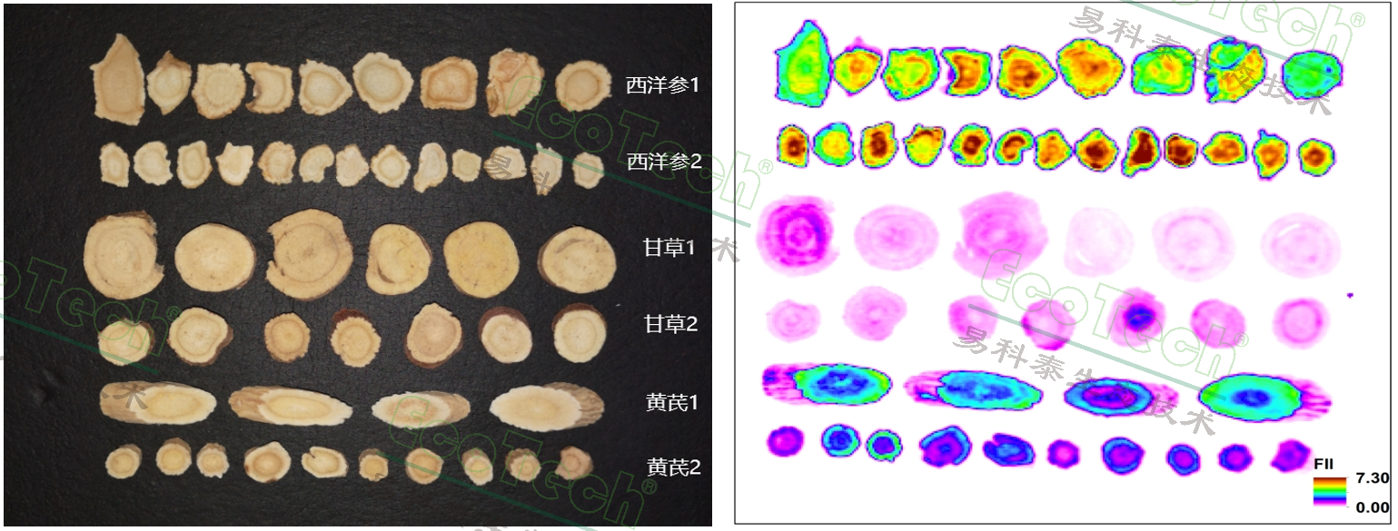 不同品種及產地的西洋參、甘草、黃芪檢測分析,兩種西洋參表現出最強的生物熒光,反映其所含的活性次級代謝產物成分含量最高