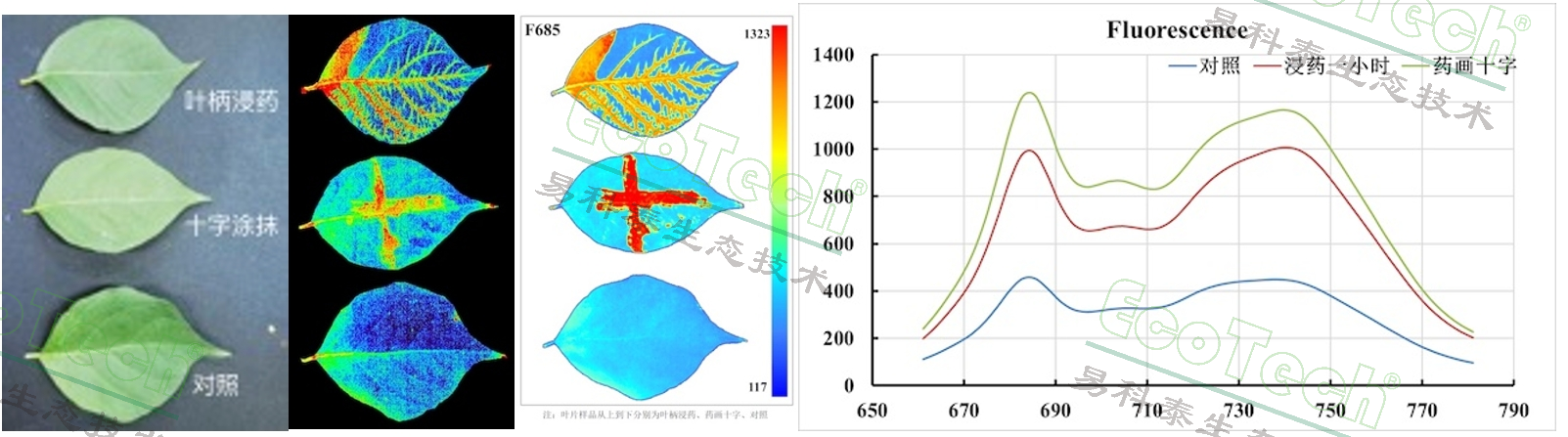 敵草隆處理烏蘞莓實驗:左圖左上角和右下角為實驗組(葉柄浸藥)、右上角和左下角為對照組,可以看出實驗組的葉柄和葉脈最大光量子產量QY_max明顯降低(藍色);右圖為其葉綠素熒光光譜,實驗組葉綠素熒光明顯高于對照組(易科泰SpectrAPP光譜成像實驗室提供)