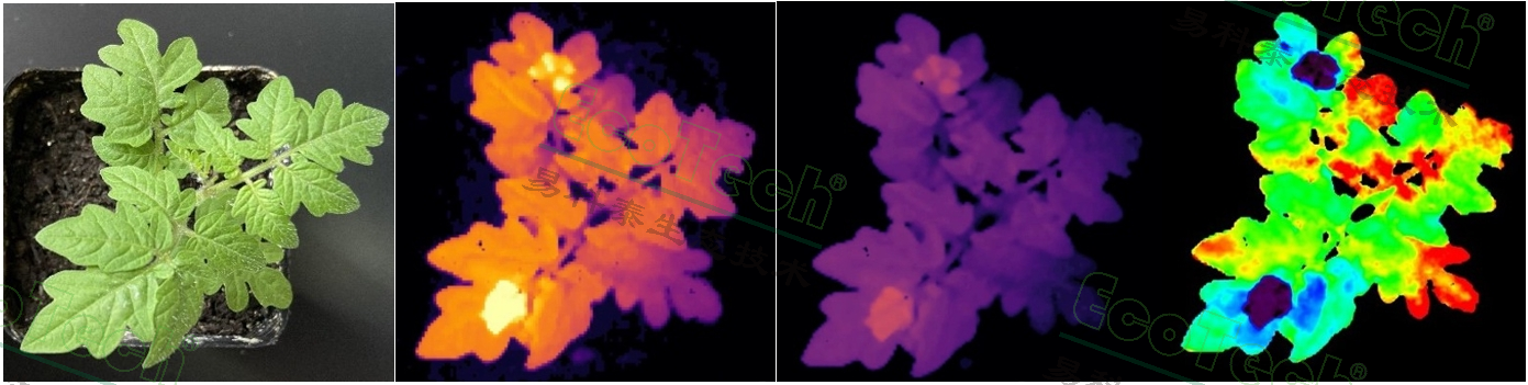 左圖:FluorTron?多功能高光譜成像分析系統(tǒng);右圖:番茄葉片葉綠素熒光成像