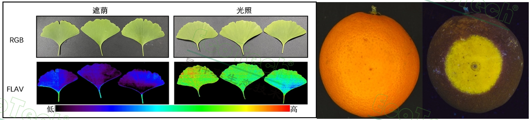 b) 可同時進行(反射光)高光譜成像,在空間維度(形影圖像)和光譜維度上對物體表面反射光信息和生物熒光信息成像,全面可視化分析其理化性質、生化組分、生理狀態(tài)(如作物光合效率、病蟲害脅迫、抗性等),變不可見為可見