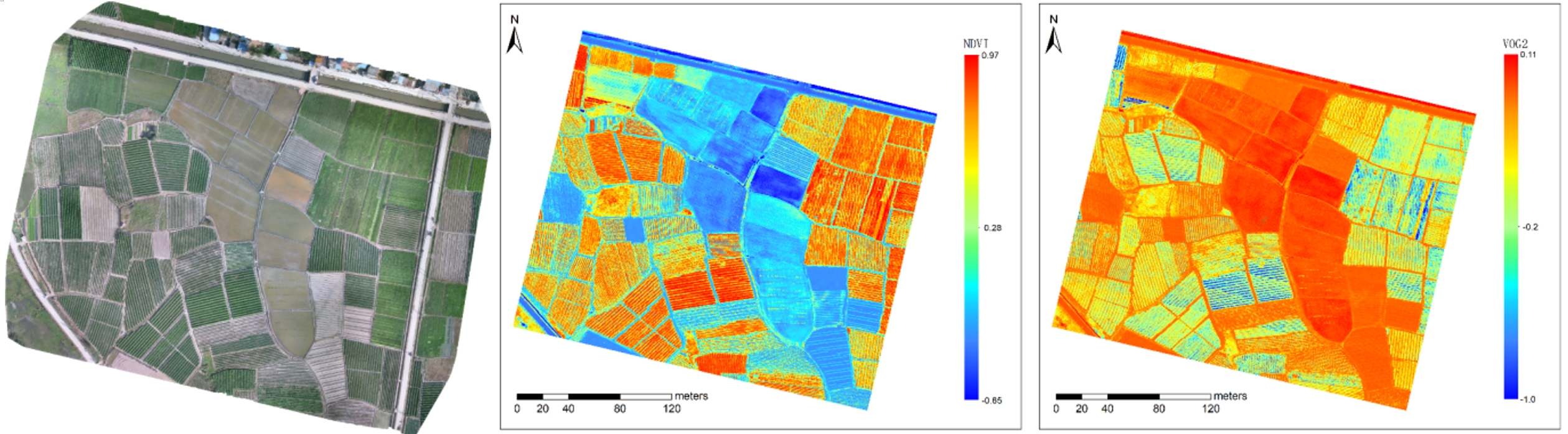 上圖依次為RGB通道合成、NDVI、VOG2,可以看出試驗(yàn)區(qū)剛插秧的水稻田整體NDVI遠(yuǎn)遠(yuǎn)低于周邊農(nóng)田,而紅邊指數(shù)VOG2則正好相反,驗(yàn)證了其對表達(dá)葉綠素含量、冠層和水含量的綜合作用的敏感程度