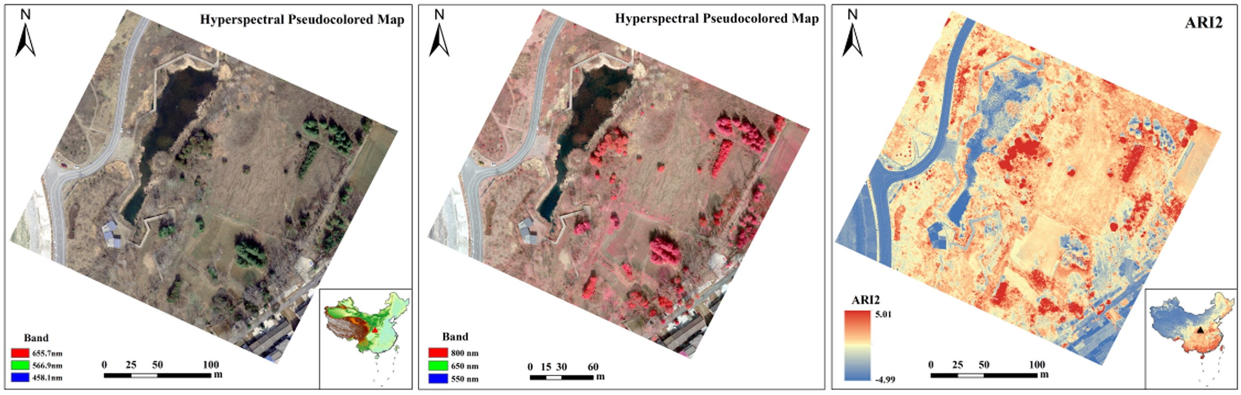 易科泰生態(tài)監(jiān)測技術(shù)實(shí)驗(yàn)高光譜成果圖——真彩色合成、假彩色合成(突出植被信息)及ARI2植被指數(shù)