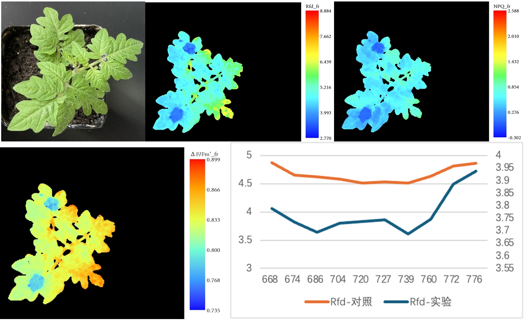 上圖自左至右依次為:DCMU處理后的番茄苗、Rfd、NPQ;下左圖為有效光量子產(chǎn)量YPSII(?F/Fm’),下右圖為施藥區(qū)域(熒光參數(shù)圖中2個(gè)深藍(lán)色斑點(diǎn)區(qū)域,選取旁邊同等大小區(qū)域作為對(duì)照區(qū)域)及對(duì)照區(qū)域的Rfd光譜響應(yīng)