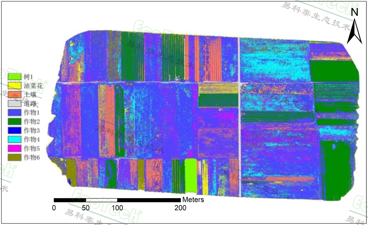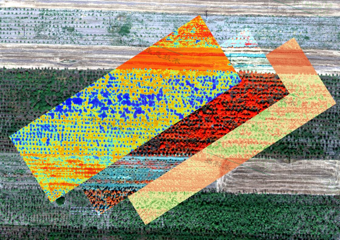 結(jié)果體現(xiàn)了Ecodrone®一體式高光譜-紅外熱成像-激光雷達(dá)無人機遙感系統(tǒng)能夠高效地實現(xiàn)多傳感器同步成像,并且將多維度數(shù)據(jù)進(jìn)行融合處理,可以進(jìn)一步對地物進(jìn)行分類統(tǒng)計,對生長進(jìn)行預(yù)測,還可分析地表植被、農(nóng)作物等的理化差異和表型信息等。