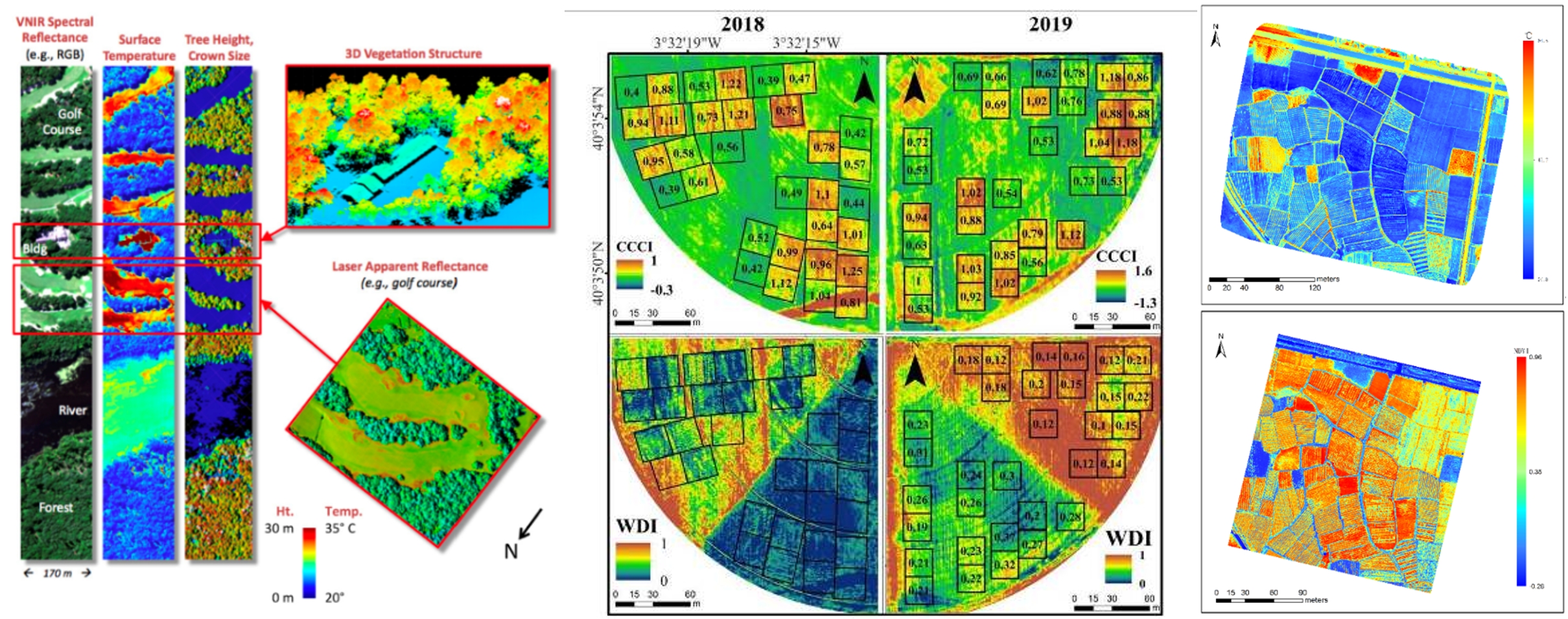 上左圖引自Bruce D. Cook等,NASA Goddard’s LiDAR, Hyperspectral and Thermal (G-LiHT) Airborne Imager, Remote Sensing 2013;上中圖引自Pancorbo J L ,Camino C , Alonso-Ayuso M , et al. Simultaneous assessment of nitrogen and water status in winter wheat using hyperspectral and thermal sensors[J]. European Journal of Agronomy, 2021, 127(3):126287.);上右圖為水稻田表型成像分析(易科泰光譜成像與無人機遙感研究中心提供)