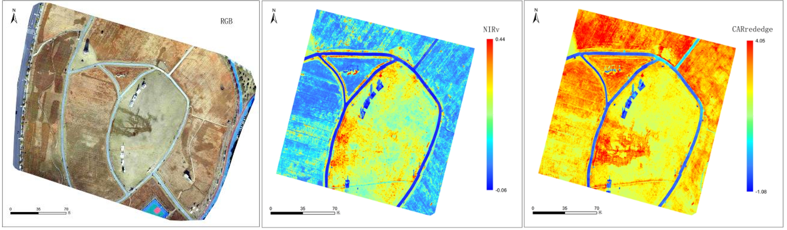 易科泰光譜成像與無人機遙感技術(shù)研究中心團(tuán)隊在某城市公園同步采集了高光譜、LiDAR、RGB及紅外熱成像等多傳感器遙感數(shù)據(jù),并進(jìn)行了分析?;诟吖庾V數(shù)據(jù)生成的植被指數(shù)可以定性和定量評價植被覆蓋及其生長狀態(tài),如下圖NIRv歸一化差異植被指數(shù)可以評估植被覆蓋度,CARrededge可用于估算類胡蘿卜素與葉綠素比值。
