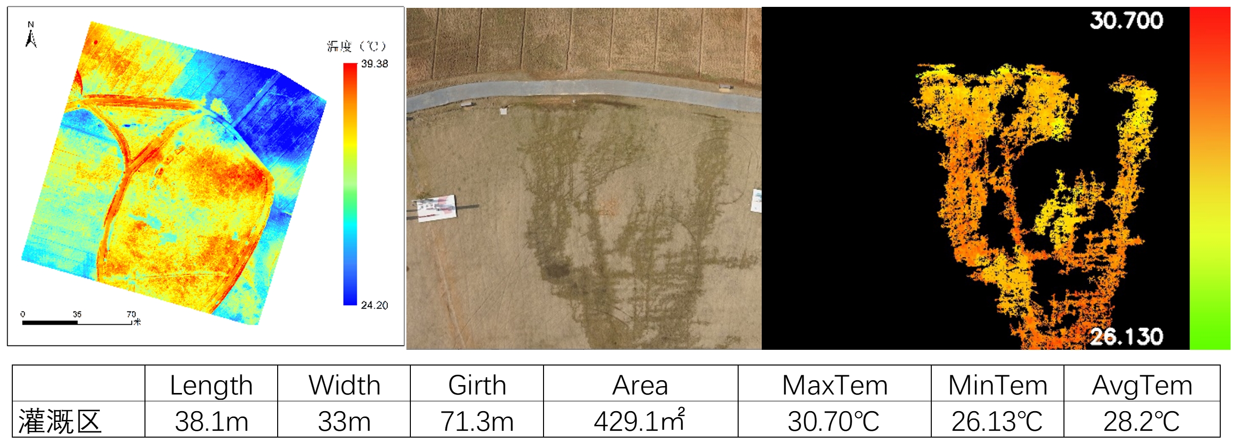 基于易科泰Thermo-RGB融合分析軟件,對草坪中灌溉區(qū)進(jìn)行可見光與紅外熱成像數(shù)據(jù)融合分析,如下圖為掩膜顯示結(jié)果,并統(tǒng)計其形狀、面積和溫度等信息,可以精確反映不同地物覆蓋情況及其溫度分布。