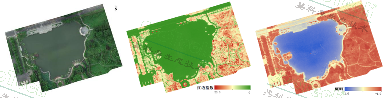 左圖:人工湖及周邊RGB圖,反映地物空間分布;中圖:紅邊比值指數(shù),突出顯示綠色植被內(nèi)部的差異;右圖:歸一化差異水體指數(shù)NDWI(易科泰光譜成像與無人機(jī)遙感技術(shù)研究中心供圖)