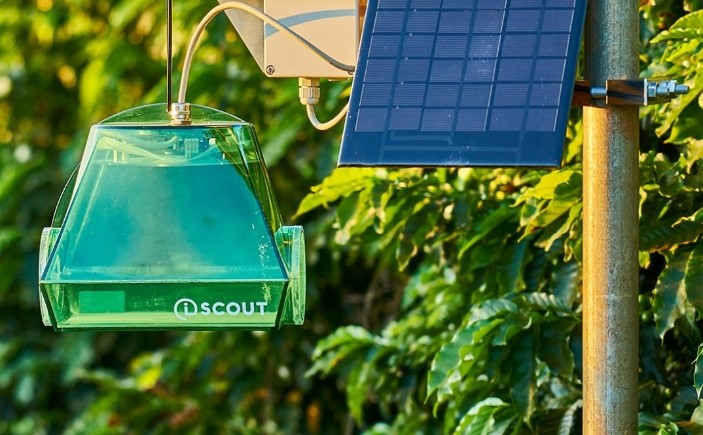 蟲情在線監(jiān)測預(yù)警系統(tǒng)由控制單元、相機(jī)、電源系統(tǒng)、誘蟲陷阱及網(wǎng)絡(luò)在線服務(wù)平臺等組成,可選配作物冠層溫度監(jiān)測模塊。主機(jī)內(nèi)置10MP攝像頭拍攝粘蟲板高分辨率圖像,通過無線網(wǎng)絡(luò)傳輸至網(wǎng)絡(luò)在線服務(wù)平臺,通過網(wǎng)絡(luò)平臺識別害蟲種類并自動統(tǒng)計(jì)每天的數(shù)量、總數(shù)和季節(jié)性昆蟲種群發(fā)展數(shù)據(jù)。系統(tǒng)由太陽能板供電,可以根據(jù)時(shí)間設(shè)置定時(shí)自動對粘蟲板上的昆蟲照相并通過無線網(wǎng)絡(luò)傳輸至網(wǎng)絡(luò)平臺。每套iSCOUT蟲情系統(tǒng)都內(nèi)置有GPS定位系統(tǒng),可以覆蓋1-5公頃范圍的蟲害情況,多臺iSCOUT可組成區(qū)域網(wǎng)絡(luò)化害蟲在線監(jiān)測預(yù)警系統(tǒng)。