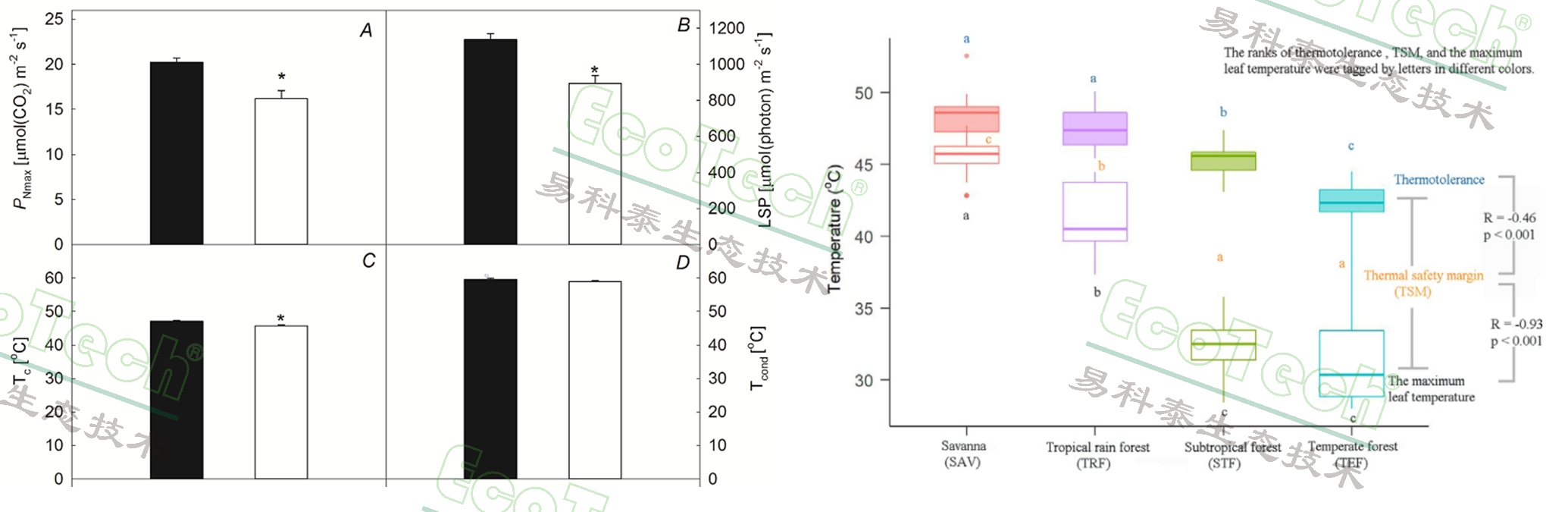 中科院西雙版納熱帶植物園:左圖:兩種羊蹄甲的光合特性與臨界溫度;右圖:四種森林類型的熱耐受溫度、熱安全裕度和最高葉溫(Zhang,2019,Photosynthetica;Kitudom,2022,Science of the Total Environment)