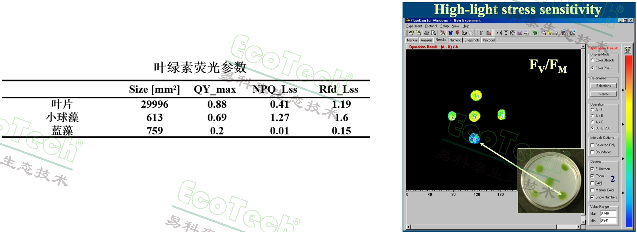 左:葉綠素?zé)晒鈪?shù)數(shù)據(jù);右:數(shù)據(jù)處理軟件界面