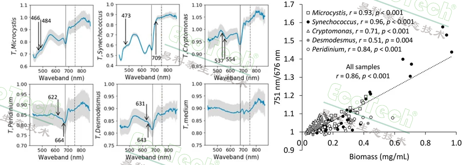 左:不同藻種的光譜曲線圖;右:不同藻種的生物量與(751/676nm)指數(shù)呈現(xiàn)很好的相關(guān)性;