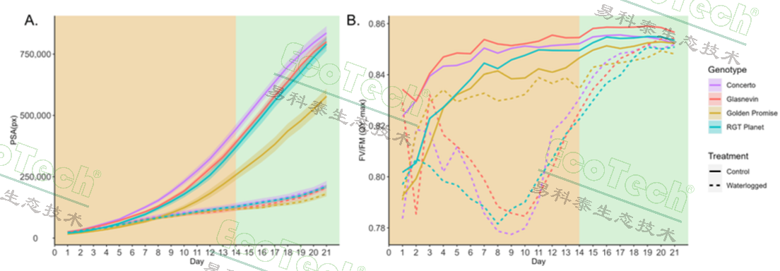 使用PlantScreen™成像平臺,每天從頂部和側(cè)面拍攝RGB圖像,以量化水淹脅迫對生長和綠色度的生理影響。通過圖像分析軟件PlantScreen™ Analyzer計算地上部投影面積(PSA,側(cè)視與俯視分割像素之和),以評估植物的生長情況。此外,在實驗2中,還進行了FluorCam動態(tài)葉綠素?zé)晒獬上?,以評估植物的光合性能。