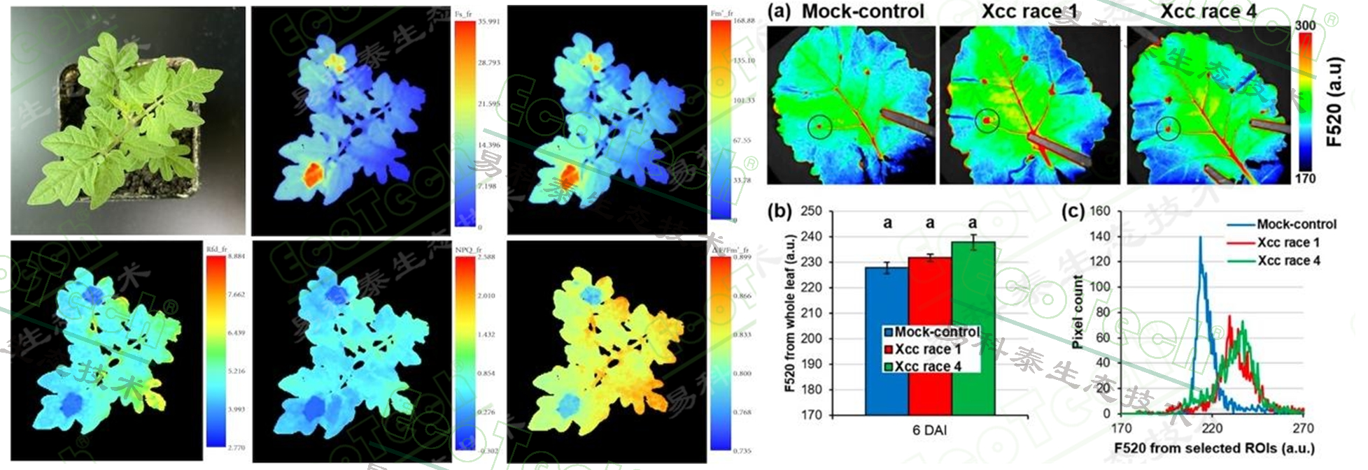 左圖:番茄光合作用損傷實驗(EcoTech®實驗室提供);右圖:機(jī)器視覺多光譜熒光成像檢測氣候變化條件下油菜黑腐病,F520為多光譜熒光成像綠色熒光(引自:Monica Pineda and Matilde Baron, 2023. Assessment of Black Rot in Oilseed Rape Grown under Climate Change Conditions Using Biochemical Methods and Computer Vision)
