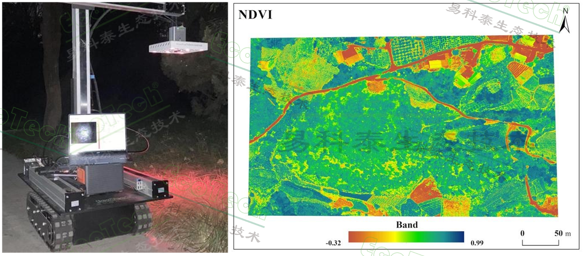 左圖:FluorTron-ROBOT葉綠素?zé)晒獬上裱矙z機(jī)器人;右圖:EcoDrone®無人機(jī)遙感NDVI影像圖