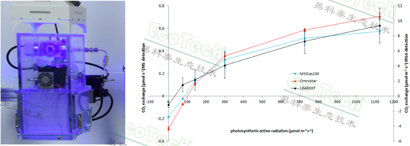 左圖,植物測量室,光照由便攜式FluorCam提供;右圖,左側 y 軸為MS GAS-100 和 Omnistar 測定的整株番茄植株的光響應曲線(藍線和紅線), 右側 y 軸為Li6400XT 測定的番茄葉片樣品的光響應曲線(黑線)
