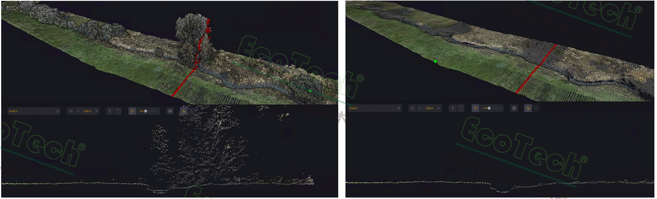 左圖:Ecodrone®激光雷達(dá)系統(tǒng);右圖:多類型水域環(huán)境的點(diǎn)云成像效果