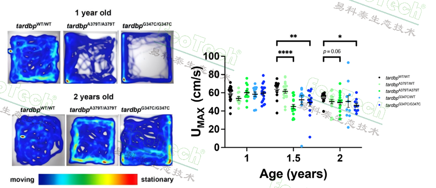 實驗結(jié)果顯示,攜帶TDP-43基因突變(A382T和G348C)的斑馬魚模型在1.5歲時表現(xiàn)出顯著的運動功能障礙,其游泳速度明顯減慢。這一發(fā)現(xiàn)表明,這些突變可能影響了斑馬魚的肌肉功能和神經(jīng)控制,進而影響其呼吸代謝效率。此外,研究人員還觀察到這些模型斑馬魚在2.35至3歲時出現(xiàn)了大脊髓運動神經(jīng)元的丟失,這與人類肌萎縮側(cè)索硬化癥(ALS)的病理特征相似。這些結(jié)果不僅揭示了TDP-43突變對斑馬魚運動功能的影響,還為理解ALS的發(fā)病機制提供了新的視角。