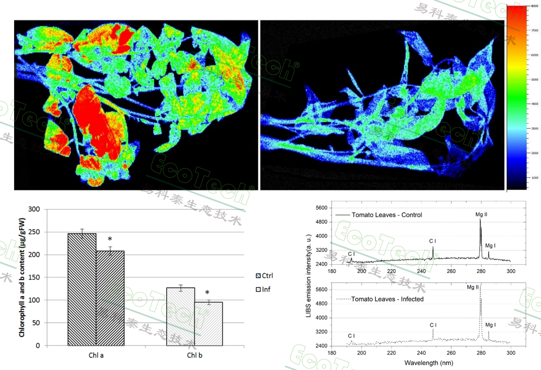 圖1. 上圖:感染根結(jié)線蟲的番茄葉片葉綠素?zé)晒獬上駥?duì)比圖;左下圖:感染根結(jié)線蟲的番茄葉片葉綠素a和葉綠素b提取含量對(duì)比;右下圖:感染根結(jié)線蟲的番茄葉片的LIBS元素分析對(duì)比光譜