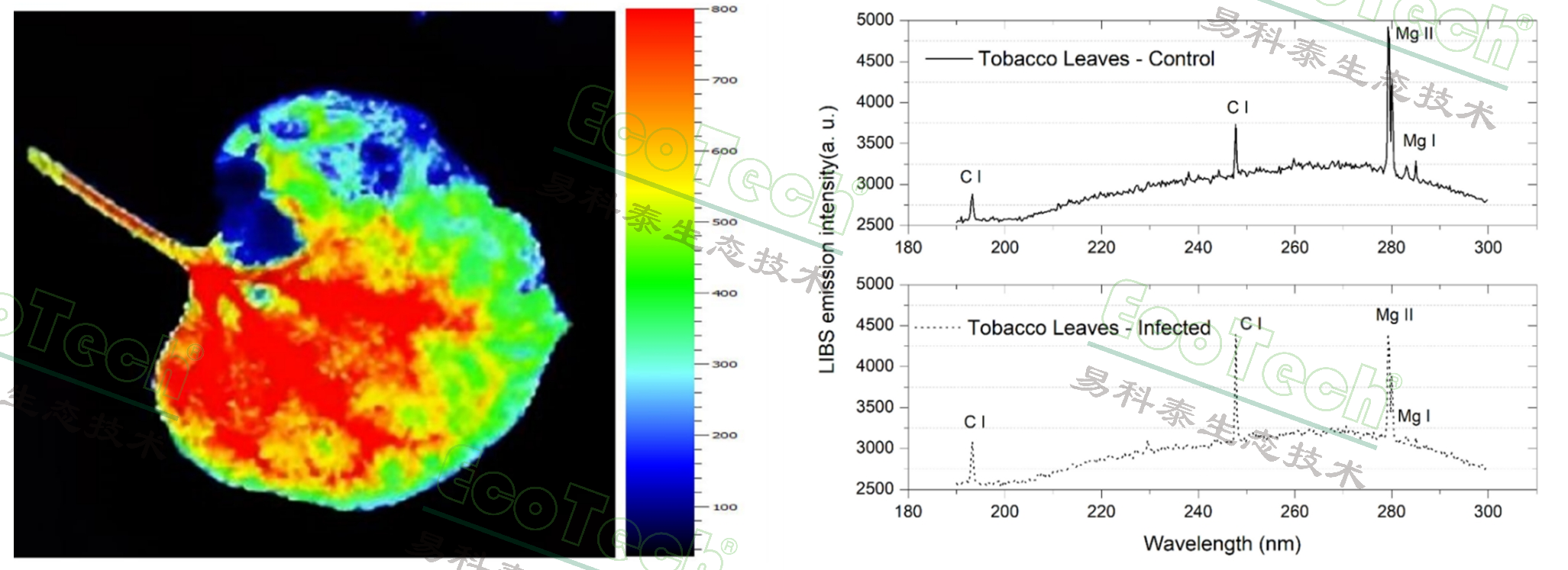 圖3. 左圖:感染建蘭花葉病毒的煙草葉片葉綠素?zé)晒獬上駡D;右圖:感染建蘭花葉病毒的煙草葉片LIBS元素對(duì)比圖譜