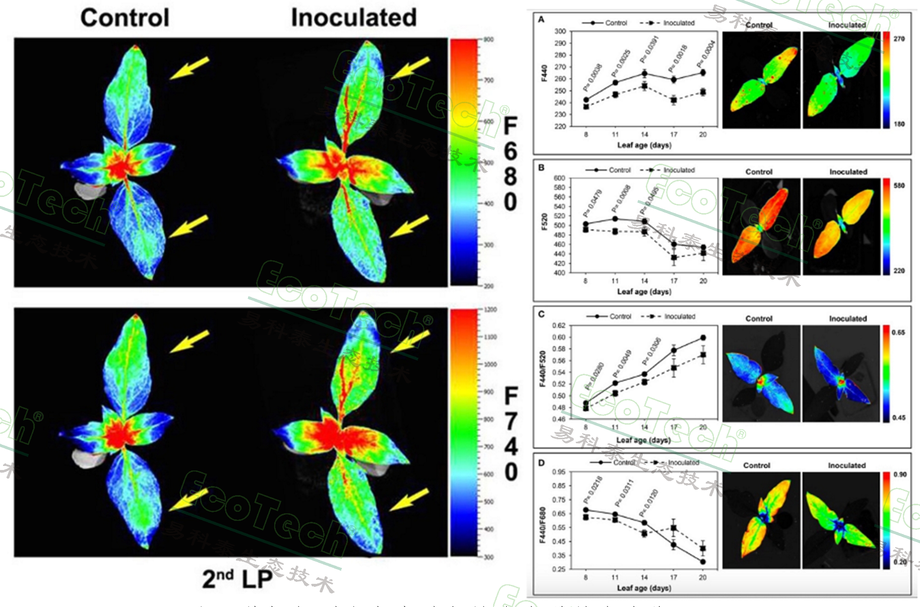 多光譜熒光可同時對脅迫誘導(dǎo)次級代謝產(chǎn)物熒光(藍綠熒光)成像,并與葉綠素?zé)晒猓t色和遠紅熒光)成像綜合分析。次生代謝物中的多酚類物質(zhì)是植物抵御病害的重要化學(xué)物質(zhì),黃酮類物質(zhì)則與抗ROS活性氧密切相關(guān),因此利用多光譜熒光能夠靈敏地進行極早期病害檢測,甚至土壤病原菌及寄生物造成的根系病害都可以通過植物地上部的多光譜熒光成像進行檢測。