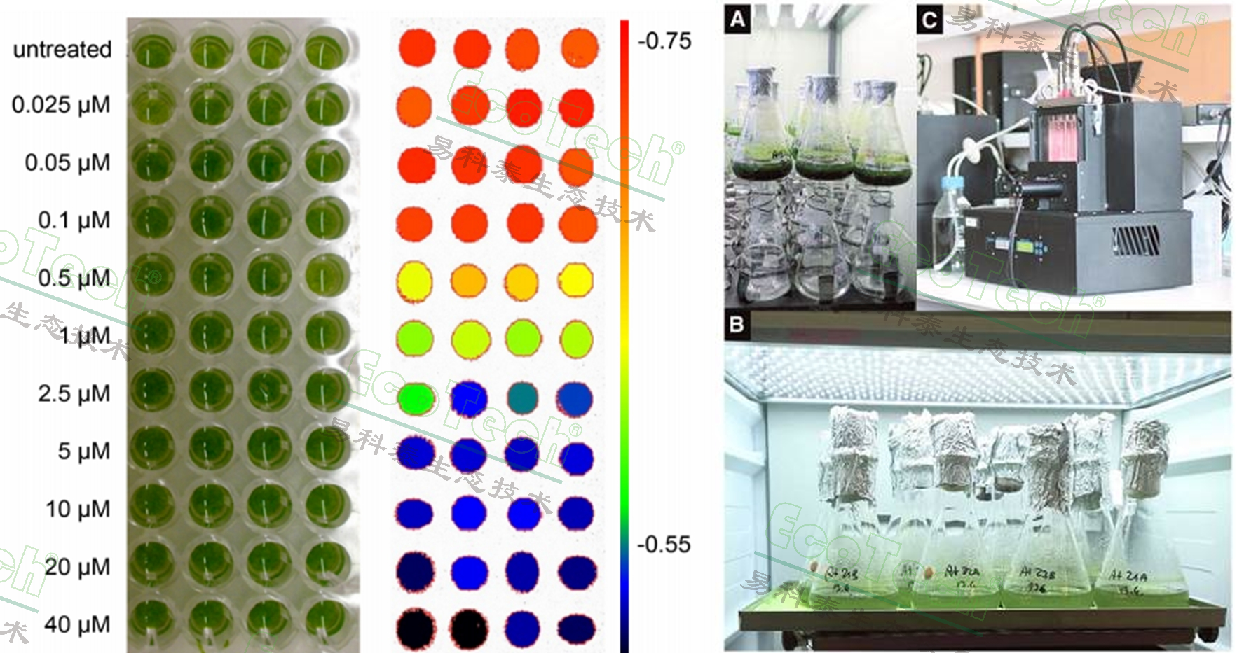捷克全球變化研究所與丹麥哥本哈根大學(xué)長期合作研究開發(fā)一種高通量生物標記篩選方法,能夠快速評估土壤與環(huán)境中毒性物質(zhì)如除草劑、重金屬等對環(huán)境生態(tài)的影響。他們使用高等植物的光自養(yǎng)細胞懸液,結(jié)合FluorCam葉綠素?zé)晒獬上裣到y(tǒng)、FMT150藻類培養(yǎng)與在線監(jiān)測系統(tǒng)、AlgaeTron AG230藻類培養(yǎng)箱等儀器開展了大量相關(guān)研究。實驗結(jié)果表明光自養(yǎng)細胞懸液結(jié)合FluorCam葉綠素?zé)晒獬上窦夹g(shù)就是一種非常好的環(huán)境毒性生物標記。