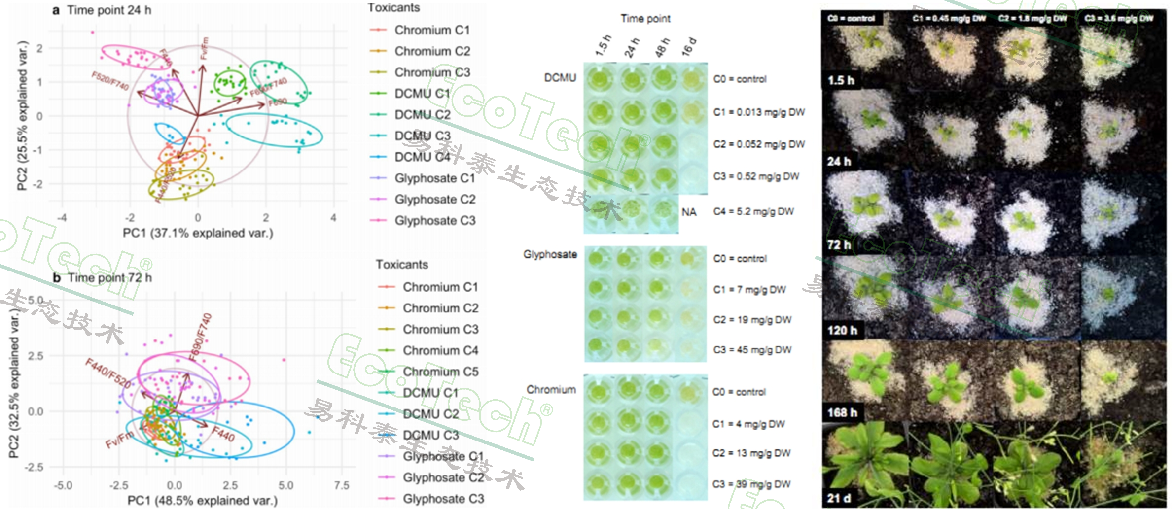 左圖:葉綠素?zé)晒獬上窈投喙庾V熒光成像數(shù)據(jù)的主成分分析;中圖:敵草隆、草甘膦和鉻處理后的擬南芥細胞懸液;右圖:敵草隆處理后的擬南芥植株