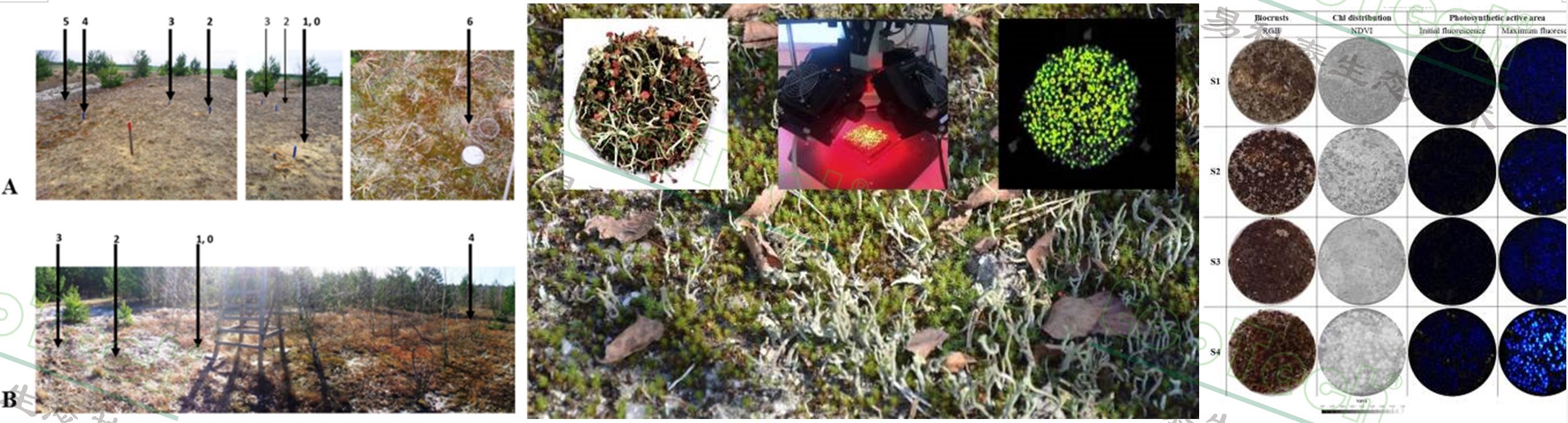 德國勃蘭登堡工業(yè)大學(xué)對多個“后采礦”區(qū)域的生態(tài)恢復(fù)進行了跟蹤研究。由于采礦區(qū)土壤貧瘠,而且可能存在重金屬、有機化合物等多種污染,因此在初期,其地表植被以地衣、苔蘚等低等植物形成的生物結(jié)皮為主。研究人員通過FluorCam葉綠素?zé)晒獬上窦夹g(shù)與反射光譜成像技術(shù)結(jié)合,評估土壤的恢復(fù)過程。研究結(jié)果表明土壤生物結(jié)皮逐漸增強的光合活性,增加了土壤碳積累,為其他高等植物的定居創(chuàng)造條件。