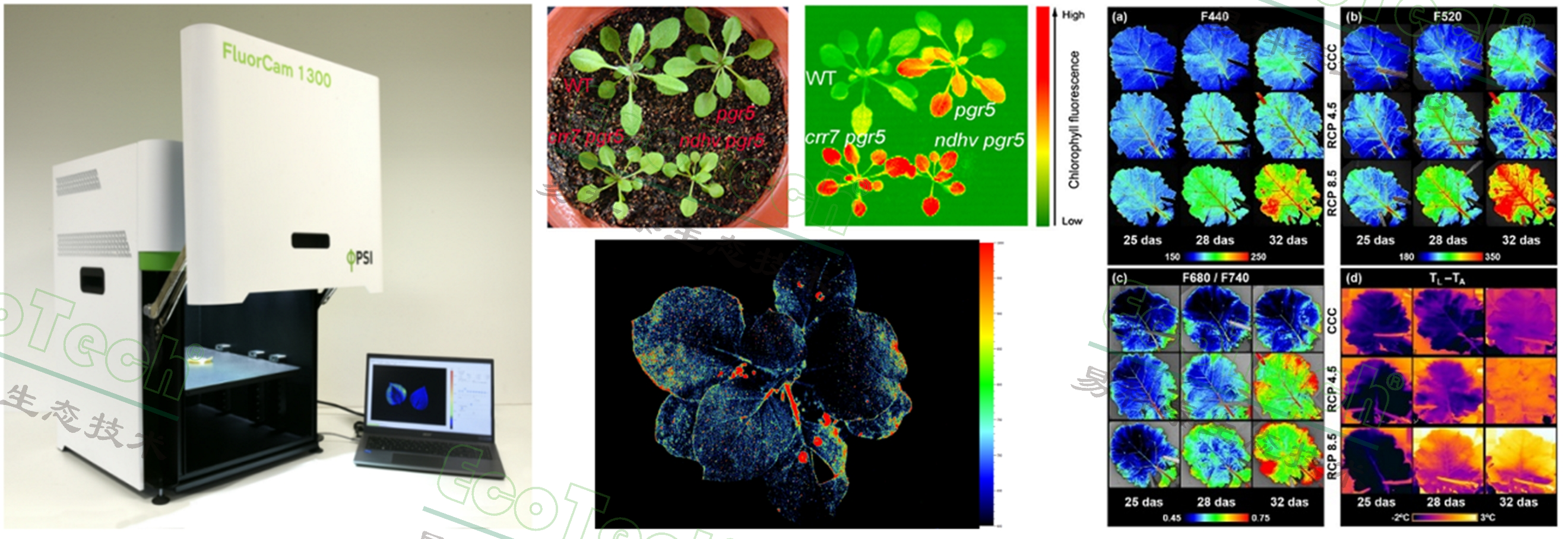 左圖:FluorCam1300多光譜熒光成像系統(tǒng),為FluorCam系列的最新產(chǎn)品;中上圖:擬南芥光合突變體篩選及功能驗證;中下圖:農(nóng)桿菌注射煙草的GFP成像;右圖:結(jié)合Thermo紅外熱成像與UV-MCF多光譜熒光成像分析溫室效應(yīng)背景下油菜的生理生態(tài)響應(yīng),包括光系統(tǒng)損傷、次生代謝物合成、葉溫變化等