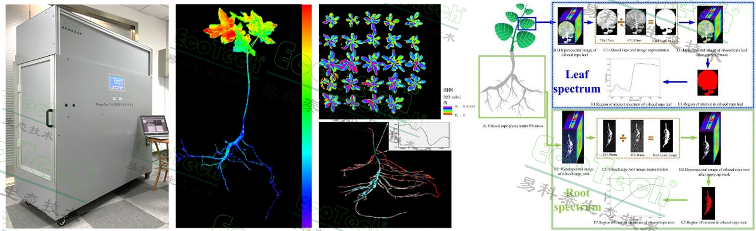 左圖:RhizoTron®植物根系高光譜成像系統(tǒng)進行的元寶槭氮素含量分布、頂部冠層高光譜成像(NDVI)與根系成像提取(EcoTech®實驗室提供),除高光譜成像外,還可配備RGB成像、紅外熱成像、多光譜成像;右圖:植物葉片與根系重金屬高光譜采集分析流程