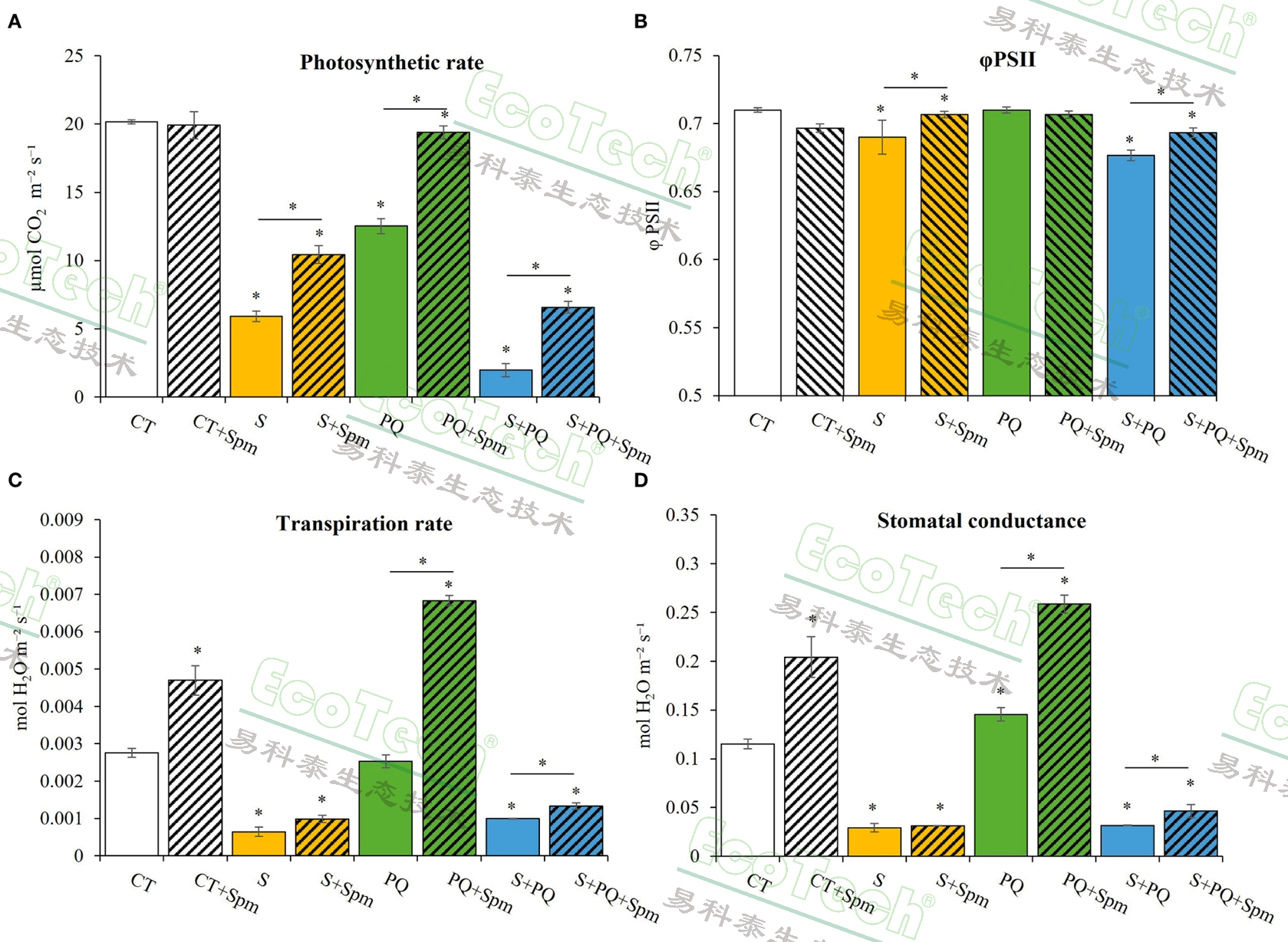 精胺(Spm)是一種多胺類化合物,已被廣泛證明能夠調(diào)節(jié)植物的生理功能,包括抗氧化防御、光合作用效率、細(xì)胞修復(fù)以及基因表達(dá)等。本文研究了外源精胺(Spm)對番茄植株在鹽脅迫(S)和除草劑百草枯(PQ)復(fù)合脅迫下的緩解作用。該研究發(fā)現(xiàn)外源精胺處理能夠顯著提高番茄植株的存活率、生長狀況、光系統(tǒng)II功能和光合速率,并減少氧化損傷標(biāo)志物(如H?O?和丙二醛)的積累。進(jìn)一步研究發(fā)現(xiàn),精胺通過降低氧化應(yīng)激,改善了番茄在復(fù)合脅迫下的耐受性。該研究為應(yīng)對氣候變化和土壤污染等多重脅迫提供了潛在的解決方案。