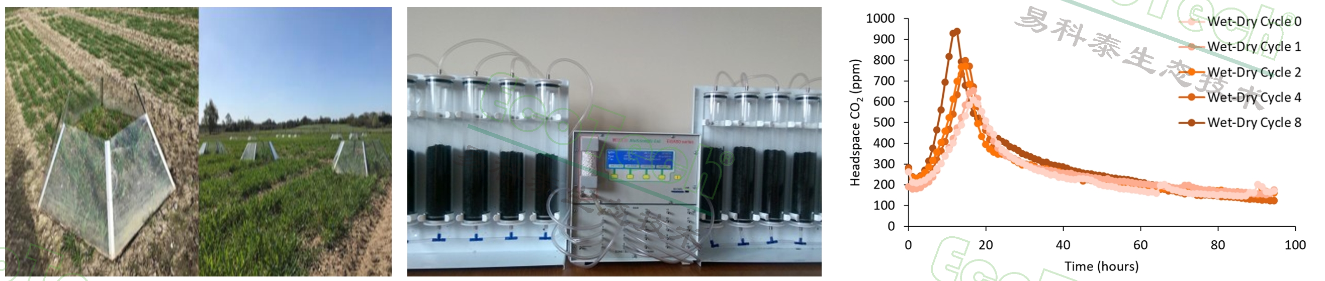文中實(shí)驗(yàn)用到了土壤化學(xué)分析儀、OTC增溫、多通道實(shí)驗(yàn)室土壤呼吸實(shí)驗(yàn)測量技術(shù)(A. Adekanmbi etc. 2023. Legacy of warming and cover crops on the response ofsoil microbial function to repeated drying and rewetting cycles)
