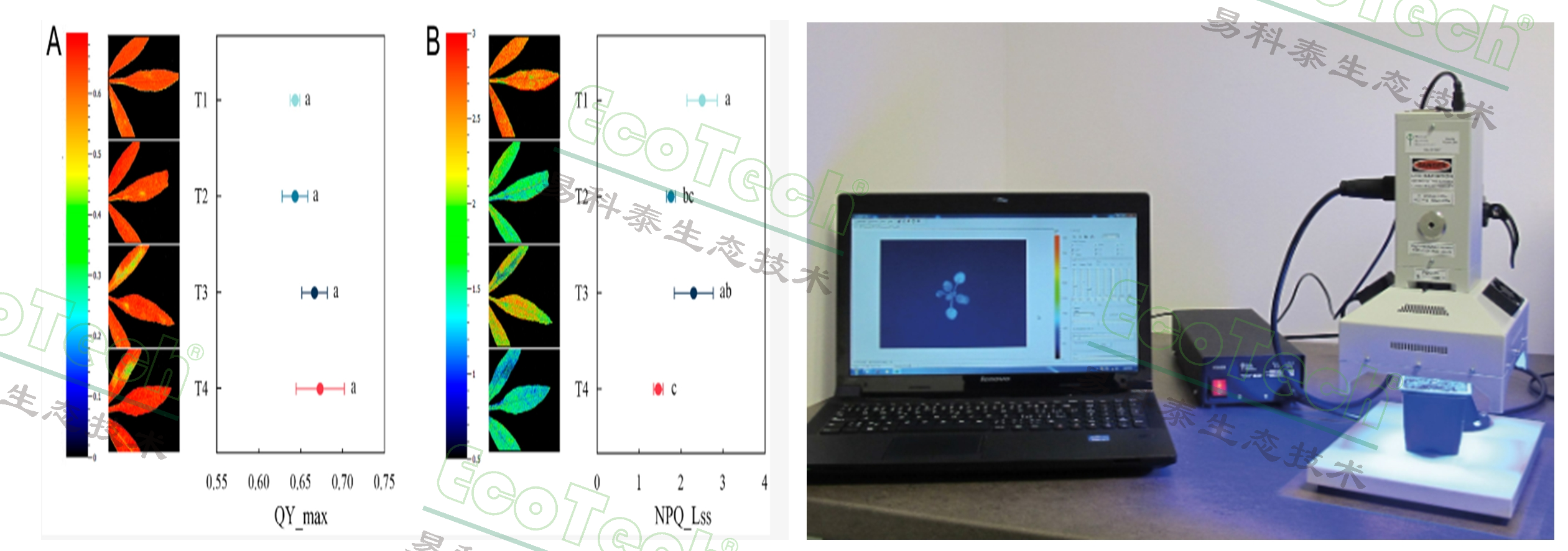 上左圖為不同修復(fù)處理之間葉綠素?zé)晒鈪?shù)的變化:(A)QY_ max(最大光量子產(chǎn)率);(B)NPQ _ Lss(非光化學(xué)熒光猝滅);右圖為便攜式葉綠素?zé)晒獬上瘢╔in Fang, Cong Shi, Fuchen Shi, etc. 2025. Phytoremediation of Oil-Contaminated Soil by Tagetes erecta L. Combined with Biochar and Microbial Agent)
