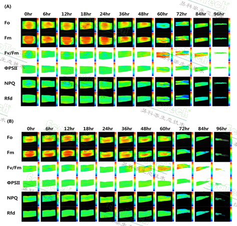 生長 96 小時(shí)的玉米幼苗的葉綠素?zé)晒獬上駞?shù)變化的比較。對 Fo、Fm、Fp 和 Ft(3A 和 C)以及 Fv/Fm、ΦPSII、NPQ 和 Rfd(3B 和 D)的比較分析。