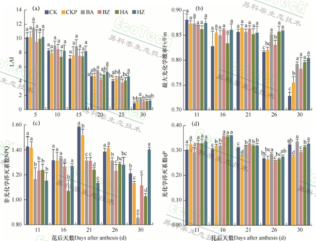 實(shí)驗(yàn)共設(shè)6種處理:空白對照CK(拔節(jié)期和開花期均噴施自來水處理)、制劑組對照CKP(兩個(gè)時(shí)期均噴施磷酸二氫鉀溶液處理)、拔節(jié)期噴施磷胺制劑(BA)、拔節(jié)期噴施磷酯制劑(BZ)、開花期單次噴施磷胺制劑(HA)、開花期單次噴施磷酯制劑(HZ),測定在不同處理下的旗葉的葉綠素?zé)晒鈪?shù)值,實(shí)驗(yàn)結(jié)果如下: